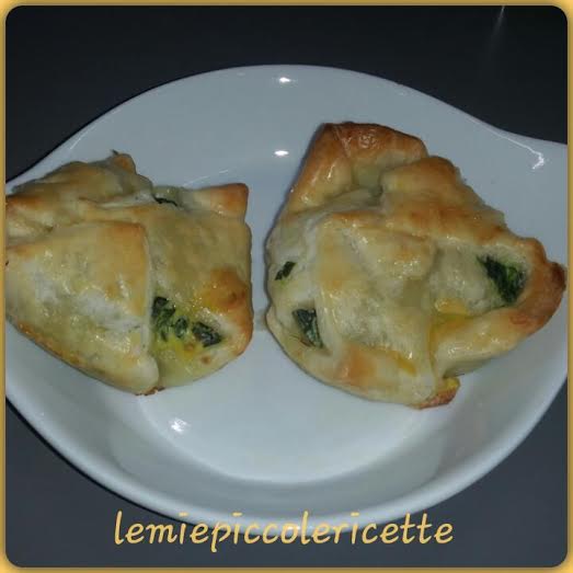 Lessate gli spinaci in acqua salata per circa 10 minuti. Scolateli e lasciateli raffreddare, privateli completamente dell'acqua e tritateli grossolanamente con una forchetta. Versate gli spinaci in una terrina e unite la ricotta, il parmigiano grattugiato, il sale e il pepe. Mescolate fino ad ottenere un composto cremoso ed omogeno. Prendete la teglia dei muffin e rivestitela con la carte forno, tagliate dei quadrati di pasta sfoglia e adagiateli all'interno di ogni stampino. Farcite con il composto di ricotta e spinaci e chiudete la sfoglia per formare dei fagattini, spennellate poi la parte superiore della sfoglia con l'uovo. Infornate a 190° C per circa 40 minuti.