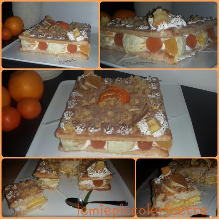 Prendere il primo strato di pasta sfolgia e sopra adaggiate uno strato di panna montata non molto alto, a questo punto disponete le 8 merenine in modo da copriere tutta la superfice. Ora ricoprite le merendine con un altro strato di panna montata e come ultimo passaggio coprite con la pasta sfoglia. Terminato l'assemblaggio della torta siete liberi di guarnirla come la si vuole io ho sbriciolato sopra un ulteriore merendina e fatto dei ciuffetti di panna e tutto di lato ho messo spicchi di arance alternandoli con le caramelle morbide.
